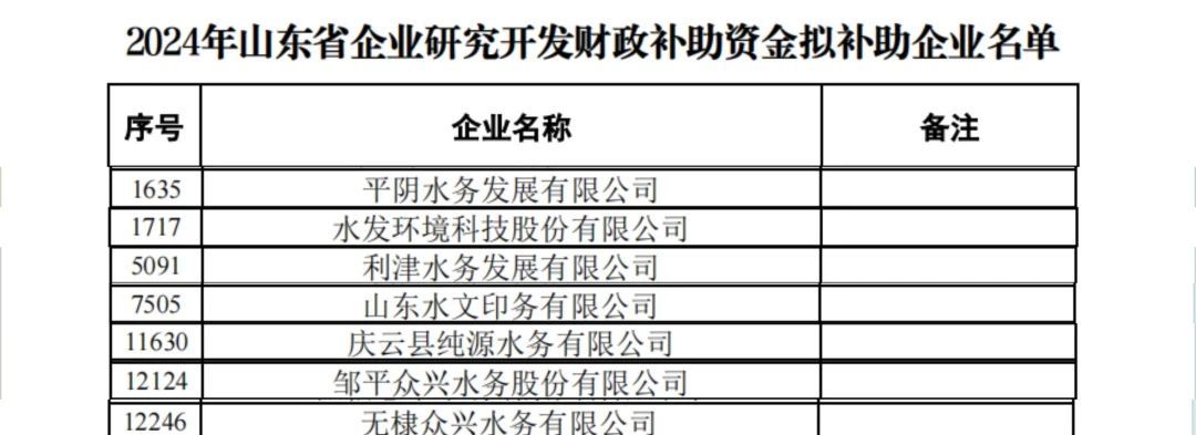 近日,山東省科技廳正式公布了2024年山東省企業(yè)研究開(kāi)發(fā)財(cái)政補(bǔ)助資金擬補(bǔ)助企業(yè)名單,水發(fā)水控集團(tuán)旗下共有7家企業(yè)成功獲批,取得政府補(bǔ)助33萬(wàn)元。